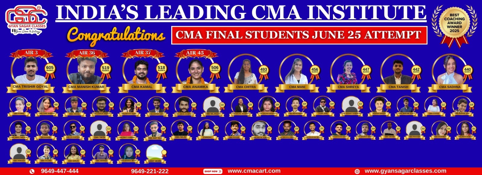 Over the years, Gyan Sagar Classes has emerged as a hub of academic excellence. Its experienced faculty, well-structured study material, and continuous evaluation through mock tests and series exams ensure that students are well-prepared for the competitive landscape of CMA exams.