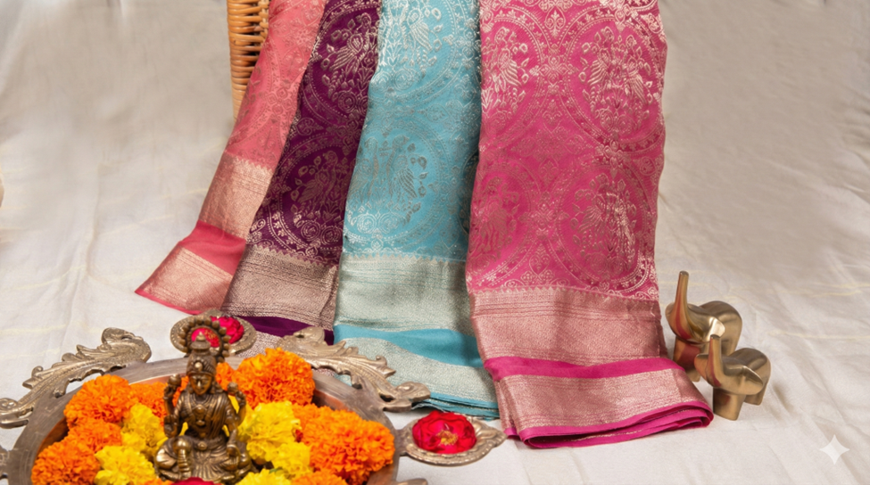 For festive occasions or moments that demand grandeur, Tatsat brings handwoven silks that balance richness with authenticity.