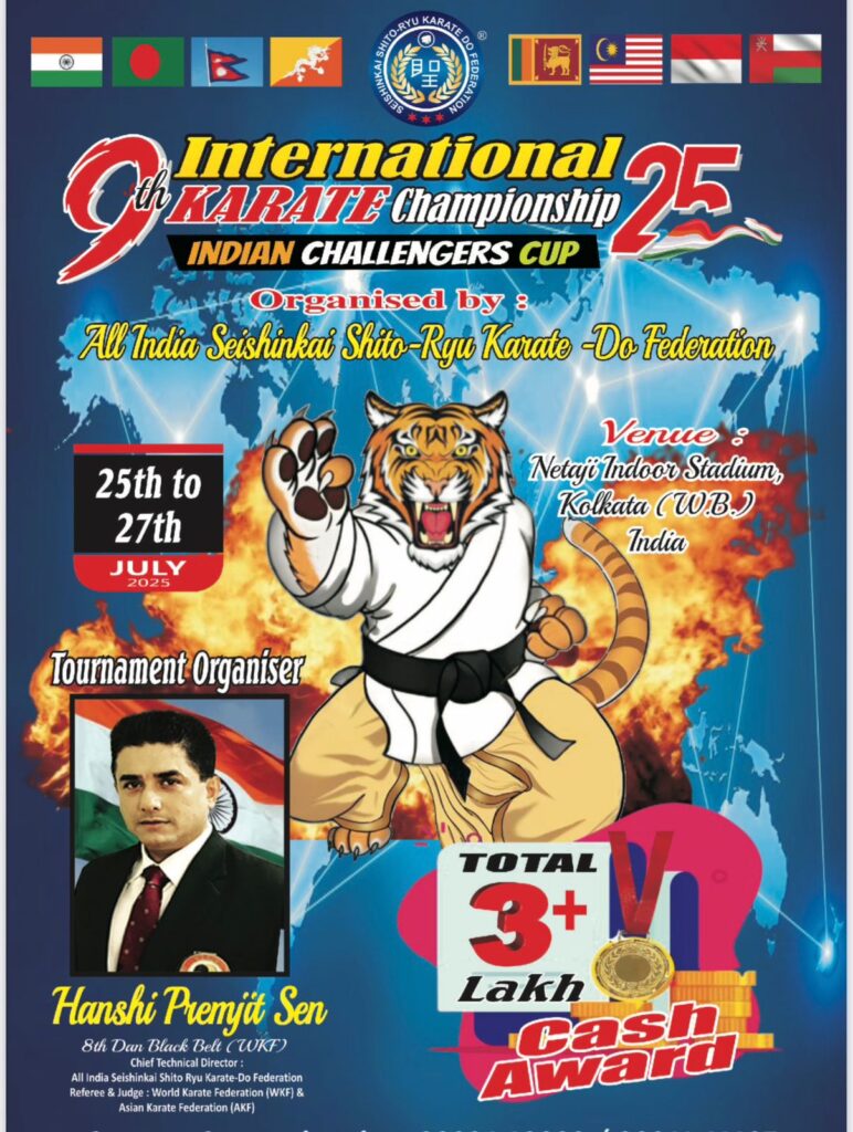Carrying forward his mission of promoting excellence in Karate, Hanshi Premjit Sen is all set to host the 9th International Karate Championship – Indian Challengers Cup 2025, from 25th to 27th July 2025 at the Netaji Indoor Stadium, Kolkata.